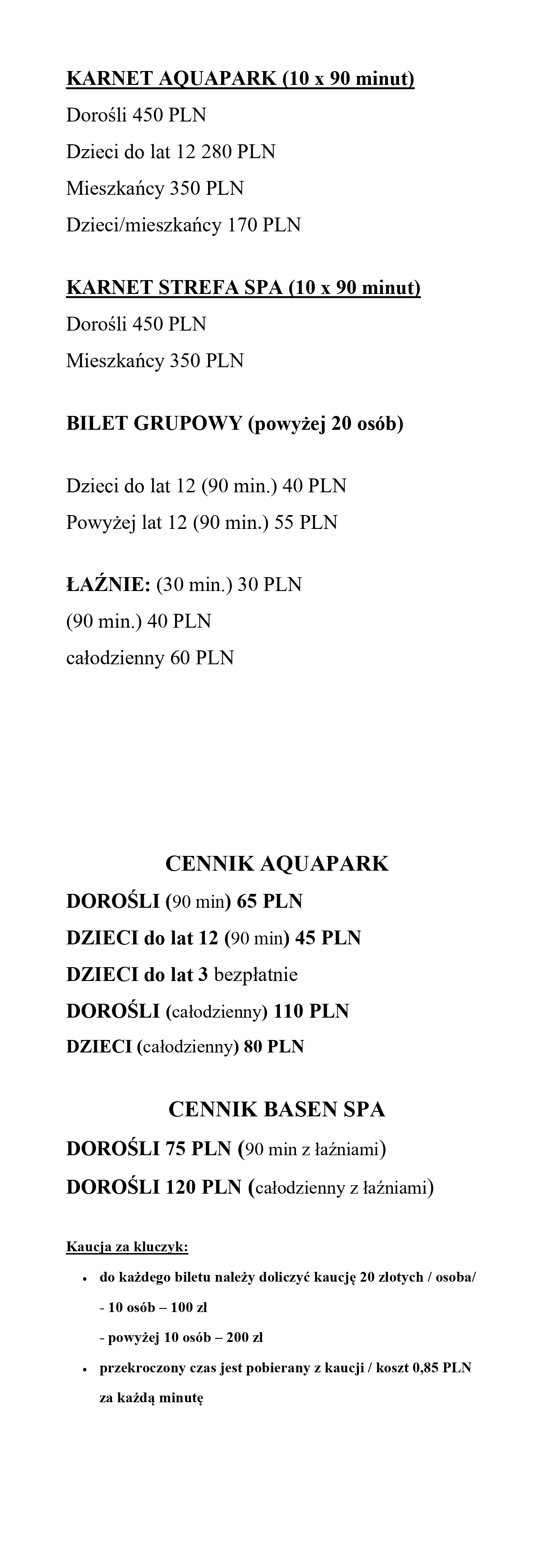 Do dyspozycji naszych gości są odkryte oraz kryte baseny, zjeżdżalnie wodne, relaksujące jacuzzi, wodne place zabaw dla najmłodszych, a także wiele innych możliwości wypoczynku. Specjalną atrakcją dedykowaną dzieciom jest wodna dżungla, w której znajduje się cała masa wodnych zabawek. Odwiedzającym aquapark pragniemy zapewnić wiele możliwości, które zachwycą ich różnorodnością wyboru, naszym przewidywaniem potrzeb oraz dbałością o szczegóły.